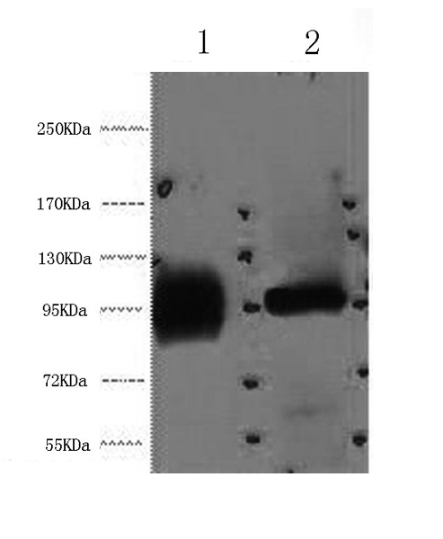 Western Blot analysis of 1) Hela, 2) 293T cells using ABCB5 Monoclonal Antibody at dilution of 1:2000.