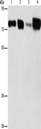 Western Blot analysis of Hepg2 and hela cell, Human fetal kidney and liver tissue using ACSL4 Polyclonal Antibody at dilution of 1:650