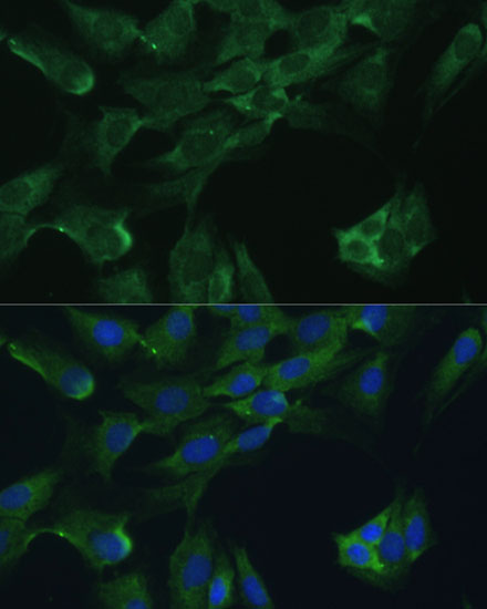 Immunofluorescence analysis of C6 cells using ADA Polyclonal Antibody at dilution of 1:100. Blue: DAPI for nuclear staining.