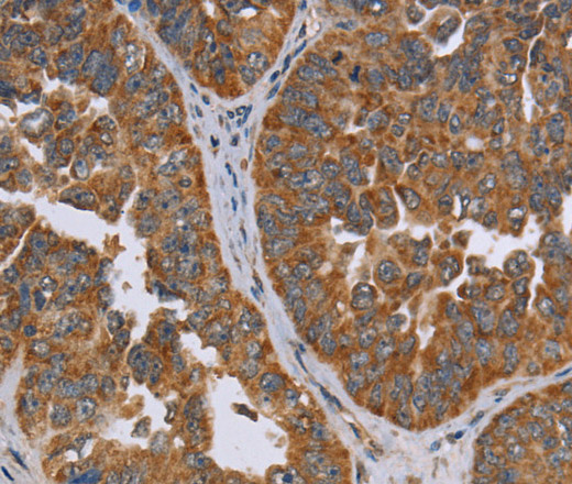 Immunohistochemistry of paraffin-embedded Human ovarian cancer tissue using ADAMTS15 Polyclonal Antibody at dilution 1:60