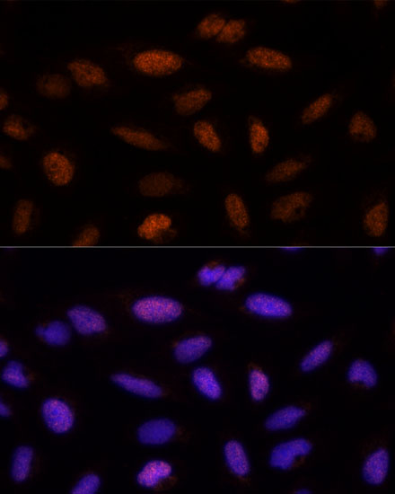 Immunofluorescence analysis of U-2 OS cells using ADNP Polyclonal Antibody at dilution of 1:100 (40x lens). Blue: DAPI for nuclear staining.