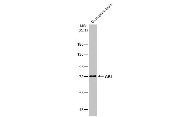 Drosophila tissue extract (50 μg) was separated by 7.5% SDS-PAGE, and the membrane was blotted with AKT antibody (GTX128415) diluted at 1:1000. The HRP-conjugated anti-rabbit IgG antibody (GTX213110-01) was used to detect the primary antibody.