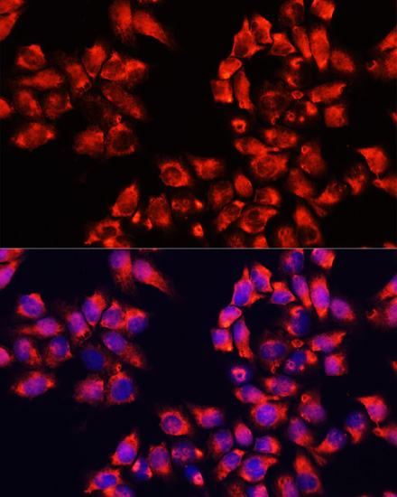 Immunofluorescence analysis of HeLa cells using ALDH7A1 Polyclonal Antibody at dilution of 1:100. Blue: DAPI for nuclear staining.
