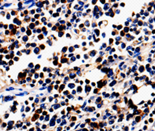 Immunohistochemistry of paraffin-embedded Human colon cancer tissue using ALOX5 Polyclonal Antibody at dilution 1:50