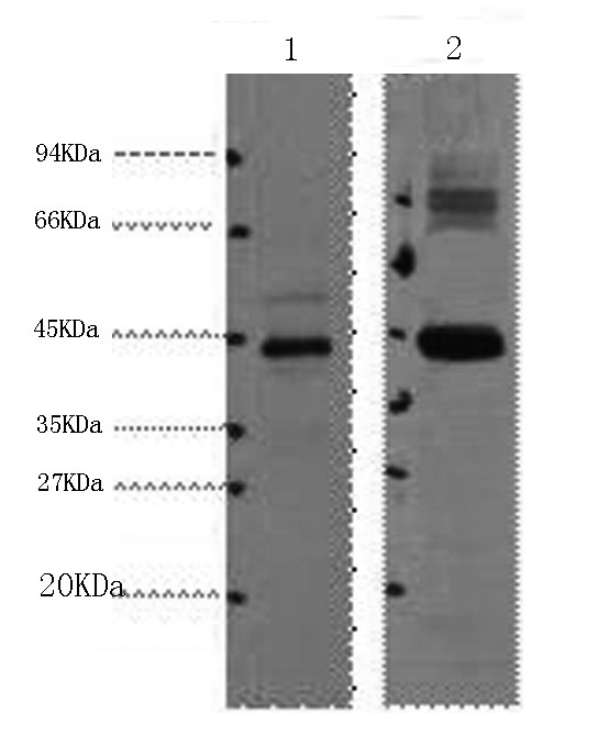 Western Blot analysis of 1) HepG2, 2) Mouse kidney using AMACR Monoclonal Antibody at dilution of 1:1000.