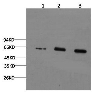Western Blot analysis of 1) Hela, 2) Mouse brain , 3) Rat brain using AMPK alpha1 Monoclonal Antibody at dilution of 1:2000.