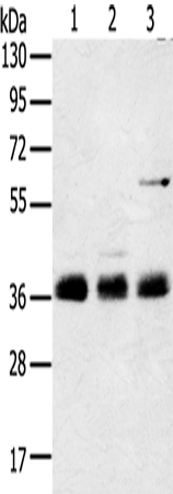 Western Blot analysis of Mouse lung tissue, NIH/3T3 and hepg2 cell using ANKRD1 Polyclonal Antibody at dilution of 1:400
