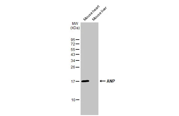 ![Various tissue extracts (50 μg) were separated by 15% SDS-PAGE, and the membrane was blotted with ANP antibody [N1C3] (GTX112698) diluted at 1:2000. The HRP-conjugated anti-rabbit IgG antibody (GTX213110-01) was used to detect the primary antibody.](https://www.genetex.com/upload/website/prouct_img/normal/GTX112698/GTX112698_44748_20220722_WB_M_R_24041019_846.webp)