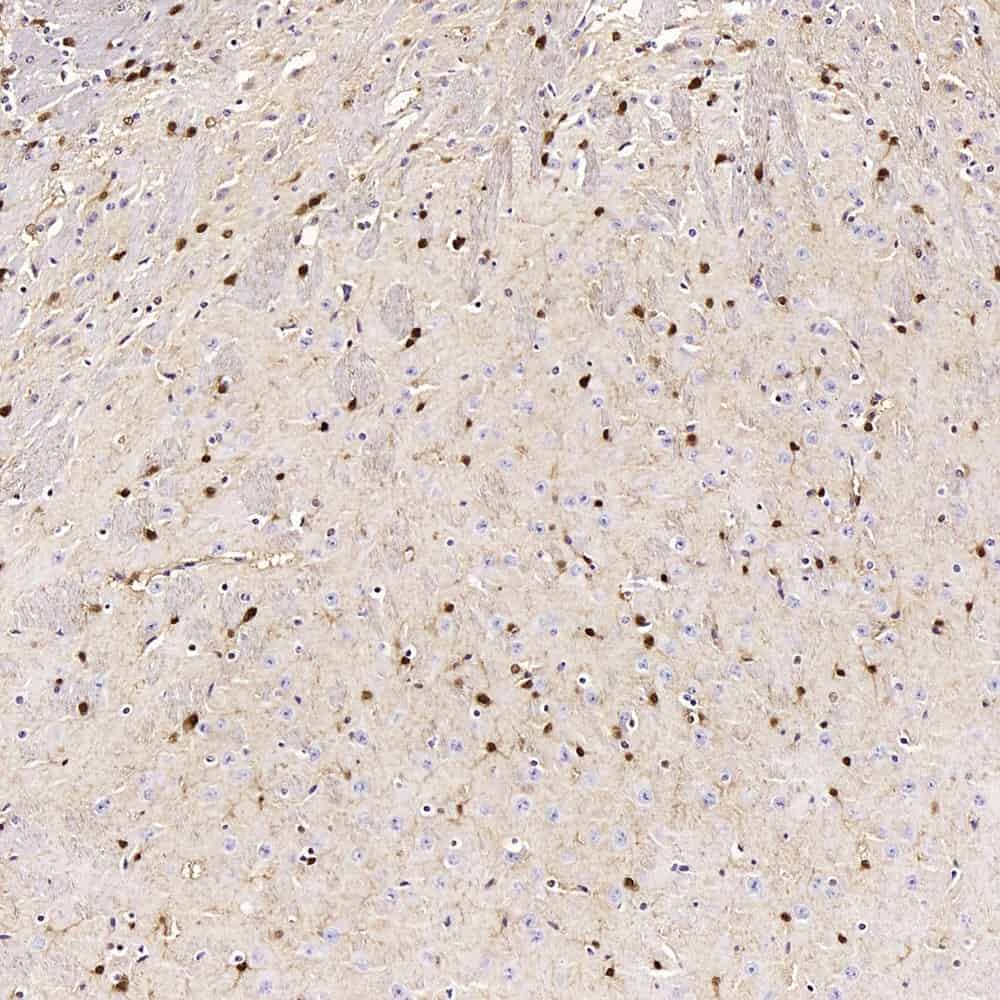 Immunohistochemistry analysis of paraffin-embedded mouse brain using S100B Polyclonal Antibody at dilution of 1:400.