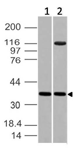 Western blot analysis of Embigin, EMB. Anti-Embigin, EMB antibody was used at 2 microg/ml on (1) PC3 and (2) Jurkat lysates.