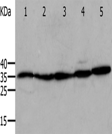 Western Blot analysis of Mouse eyes and heart, Human cervical cancer tissue, OP9 and RAW264.7 cell using ANXA5 Polyclonal Antibody at dilution of 1:750