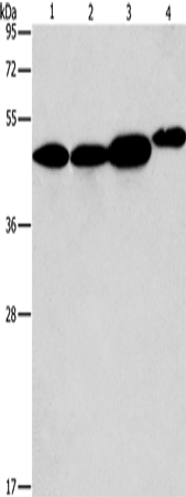 Western Blot analysis of 293T, A549, PC3 and NIH/3T3 cell using ARFGAP1 Polyclonal Antibody at dilution of 1:600