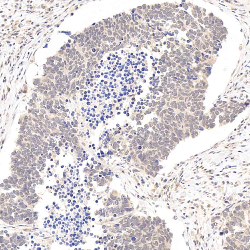 Immunohistochemistry analysis of paraffin-embedded human lung cancer using ATF6 Polyclonal Antibody at dilution of 1:400.
