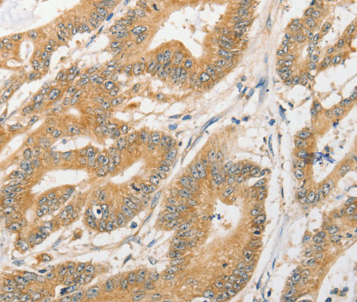 Immunohistochemistry of paraffin-embedded Human colon cancer tissue using ATG5 Polyclonal Antibody at dilution 1:40