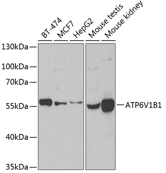 Western blot analysis of extracts of various cell lines using ATP6V1B1 Polyclonal Antibody at dilution of 1:1000.