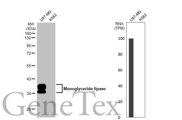 ![Various whole cell extracts (30 μg) were separated by 10% SDS-PAGE, and the membrane was blotted with Monoglyceride lipase antibody [HL1937] (GTX637774) diluted at 1:1000. The HRP-conjugated anti-rabbit IgG antibody (GTX213110-01) was used to detect the primary antibody, and the signal was developed with Trident ECL plus-Enhanced. Corresponding RNA expression data for the same cell lines are based on Human Protein Atlas program. Various whole cell extracts (30 μg) were separated by 10% SDS-PAGE, and the membrane was blotted with Monoglyceride lipase antibody [HL1937] (GTX637774) diluted at 1:1000. The HRP-conjugated anti-rabbit IgG antibody (GTX213110-01) was used to detect the primary antibody, and the signal was developed with Trident ECL plus-Enhanced. Corresponding RNA expression data for the same cell lines are based on Human Protein Atlas program.](https://www.genetex.com/upload/website/prouct_img/normal/GTX637774/GTX637774_44907_20230120_WB_TPM_watermark_23011618_427.webp)