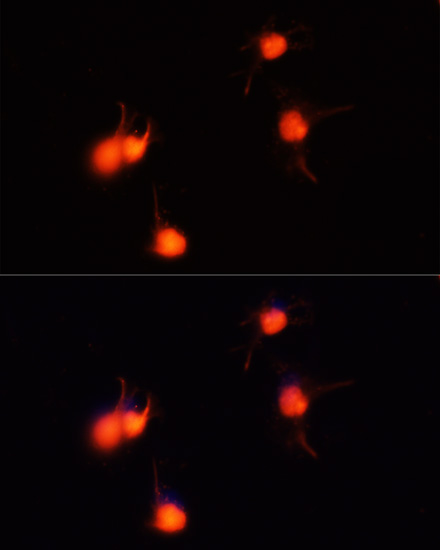 Immunofluorescence analysis of U-251MG cells using BDNF Polyclonal Antibody at dilution of 1:100 (40x lens). Blue: DAPI for nuclear staining.