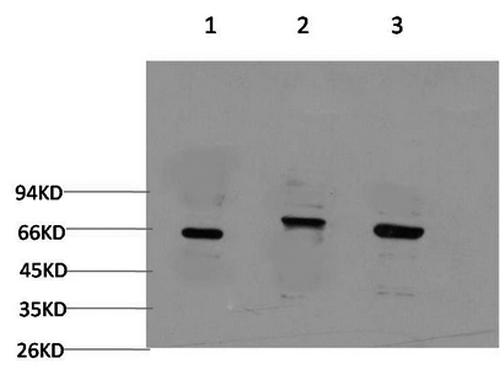 Western Blot analysis of 1) 293T, 2) C2C12, 3) Rat brain using BECN1 Monoclonal Antibody at dilution of 1:2000.