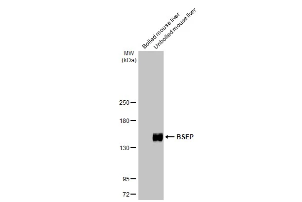 Boiled and unboiled mouse liver extracts (50 μg) were separated by 5% SDS-PAGE, and the membrane was blotted with BSEP antibody [HL2803] (GTX639695) diluted at 1:1000. The HRP-conjugated anti-rabbit IgG antibody (GTX213110-01) was used to detect the primary antibody.