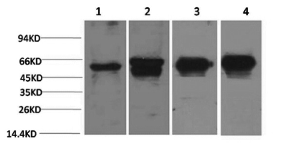 Western Blot analysis of 1) Hela, 2) 293T, 3) Mouse brain, 4) Rat brain using c-Fos Monoclonal Antibody at dilution of 1:2000.