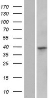 Western blot validation of overexpression lysate (Cat# LY423203) using anti-DDK antibody (Cat# TA50011-100). Left: Cell lysates from un-transfected HEK293T cells; Right: Cell lysates from HEK293T cells transfected with RC223803 using transfection reagent MegaTran 2.0 (Cat# TT210002).