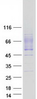 Coomassie blue staining of purified GLMP protein (Cat# TP305863). The protein was produced from HEK293T cells transfected with GLMP cDNA clone (Cat# RC205863) using MegaTran 2.0 (Cat# TT210002).