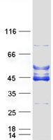 Coomassie blue staining of purified ARMC12 protein (Cat# TP306111). The protein was produced from HEK293T cells transfected with ARMC12 cDNA clone (Cat# RC206111) using MegaTran 2.0 (Cat# TT210002).