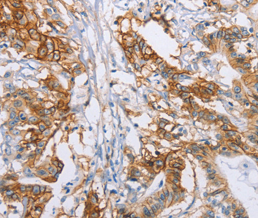 Immunohistochemistry of paraffin-embedded Human colon cancer tissue using CA9 Polyclonal Antibody at dilution 1:50