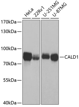 Western blot analysis of extracts of various cell lines using CALD1 Polyclonal Antibody at 1:1000 dilution.
