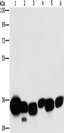 Western Blot analysis of Mouse liver and Human fetal lung tissue, hela cell and Mouse kidney tissue, Human brain malignant glioma tissue and K562 cell using CBR1 Polyclonal Antibody at dilution of 1:1000