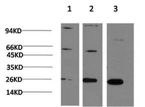 Western Blot analysis of 1) Hela, 2)3T3, 3) PC-12 cells using CBX3 Monoclonal Antibody at dilution of 1:1000.