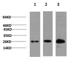 Western Blot analysis of 1) Hela, 2) 3T3, 3) PC12 cells using CBX3 Monoclonal Antibody at dilution of 1:1000.