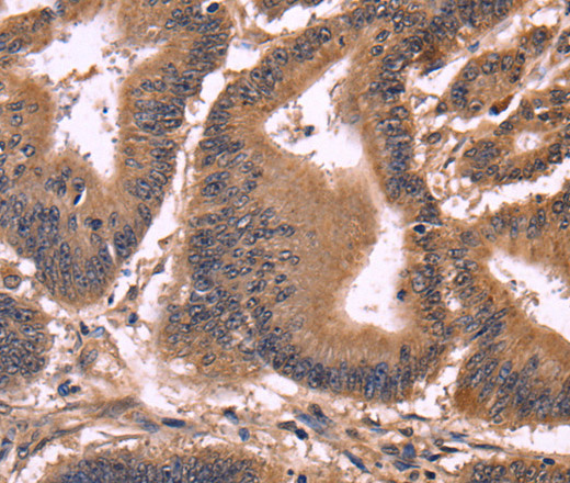 Immunohistochemistry of paraffin-embedded Human colon cancer tissue using CCDC106 Polyclonal Antibody at dilution 1:50
