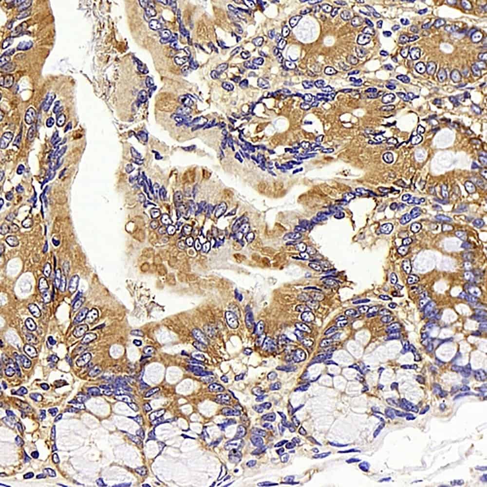 Immunohistochemistry analysis of paraffin-embedded rat colon using CD13 Polyclonal Antibody at dilution of 1:400.