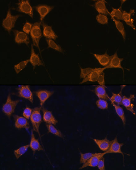 Immunofluorescence analysis of NIH/3T3 cells using CD133 Polyclonal Antibody at dilution of 1:100. Blue: DAPI for nuclear staining.