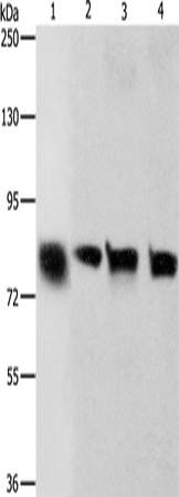 Western Blot analysis of Hela and A549 cell, Human liver cancer tissue and HT-29 cell using K-Cadherin Polyclonal Antibody at dilution of 1:500