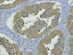 Immunohistochemistry of paraffin-embedded Human colon cancer tissue using CK-19 Monoclonal Antibody at dilution of 1:200.