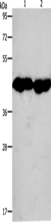 Western Blot analysis of Mouse muscle and Heart tissue using CKM Polyclonal Antibody at dilution of 1:950