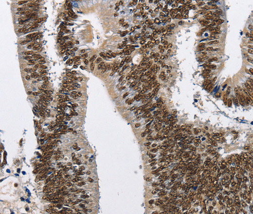Immunohistochemistry of paraffin-embedded Human colon cancer tissue using CMTM2 Polyclonal Antibody at dilution 1:60