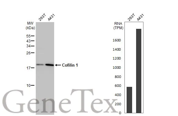 ![Various whole cell extracts (30 μg) were separated by 15% SDS-PAGE, and the membrane was blotted with Cofilin 1 antibody [GT567] (GTX628804) diluted at 1:1000. The HRP-conjugated anti-mouse IgG antibody (GTX213111-01) was used to detect the primary antibody. Corresponding RNA expression data for the same cell lines are based on Human Protein Atlas program. Various whole cell extracts (30 μg) were separated by 15% SDS-PAGE, and the membrane was blotted with Cofilin 1 antibody [GT567] (GTX628804) diluted at 1:1000. The HRP-conjugated anti-mouse IgG antibody (GTX213111-01) was used to detect the primary antibody. Corresponding RNA expression data for the same cell lines are based on Human Protein Atlas program.](https://www.genetex.com/upload/website/prouct_img/normal/GTX628804/GTX628804_41204_20230210_WB_TPM_watermark_23021401_497.webp)