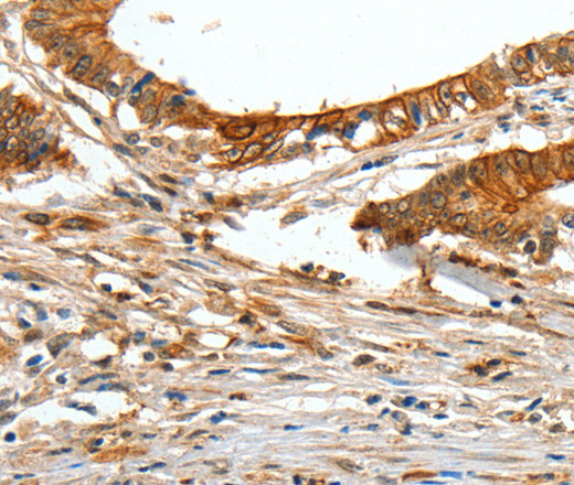 Immunohistochemistry of paraffin-embedded Human colon cancer tissue using COL1A2 Polyclonal Antibody at dilution 1:70