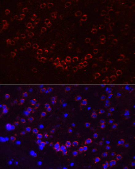 Immunofluorescence analysis of Mouse brain using GJA1 Polyclonal Antibody at dilution of 1:100 (40x lens). Blue: DAPI for nuclear staining.