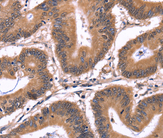 Immunohistochemistry of paraffin-embedded Human colon cancer tissue using CRK Polyclonal Antibody at dilution 1:50