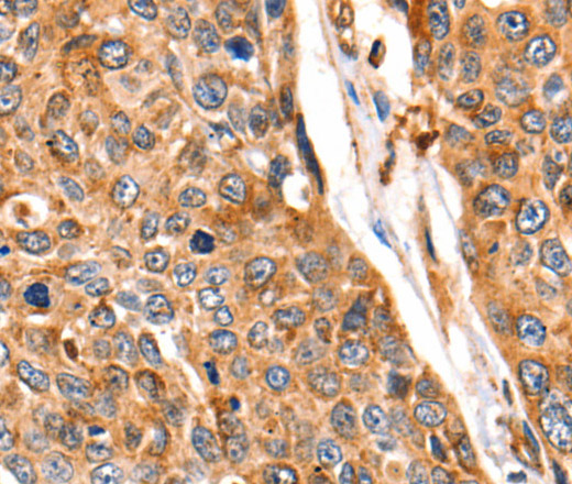 Immunohistochemistry of paraffin-embedded Human esophagus cancer tissue using Cathepsin B Polyclonal Antibody at dilution 1:140