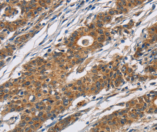 Immunohistochemistry of paraffin-embedded Human gasrtic cancer tissue using CYP21A2 Polyclonal Antibody at dilution 1:60