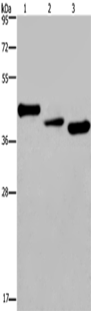 Western Blot analysis of Mouse heart tissue, A549 and HepG2 cell using CYR61 Polyclonal Antibody at dilution of 1:300