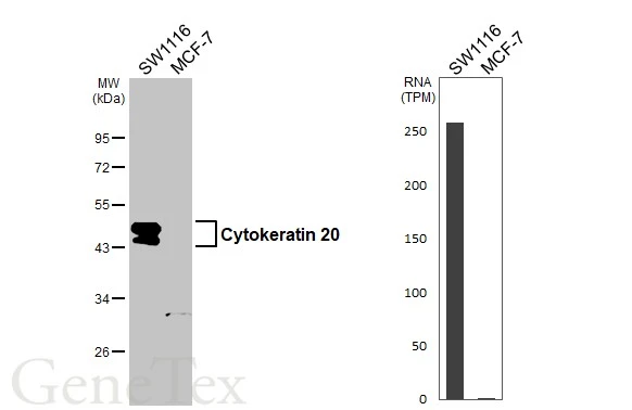 ![Various whole cell extracts (30 μg) were separated by 10% SDS-PAGE, and the membrane was blotted with Cytokeratin 20 antibody [HL3309] (GTX641071) diluted at 1:1000. The HRP-conjugated anti-rabbit IgG antibody (GTX213110-01) was used to detect the primary antibody. Corresponding RNA expression data for the same cell lines are based on Human Protein Atlas program. Various whole cell extracts (30 μg) were separated by 10% SDS-PAGE, and the membrane was blotted with Cytokeratin 20 antibody [HL3309] (GTX641071) diluted at 1:1000. The HRP-conjugated anti-rabbit IgG antibody (GTX213110-01) was used to detect the primary antibody. Corresponding RNA expression data for the same cell lines are based on Human Protein Atlas program.](https://www.genetex.com/upload/website/prouct_img/normal/GTX641071/GTX641071_T-45544_20240927_WB_TPM_watermark_24100318_380.webp)