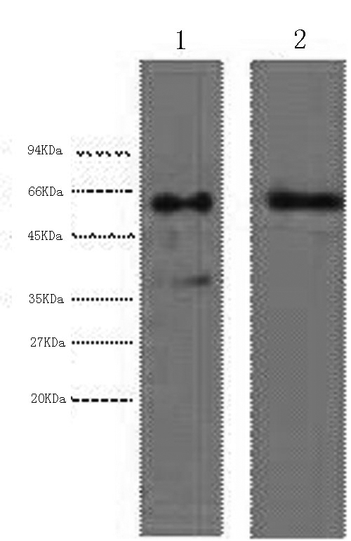 Western Blot analysis of 1) Hela, 2) HepG2 cells using CK-6A/B/C Monoclonal Antibody at dilution of 1:2000.
