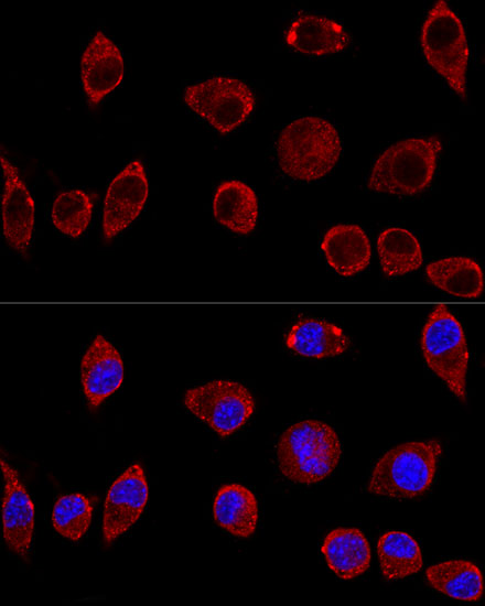 Confocal immunofluorescence analysis of L929 cells using DAO Polyclonal Antibody at dilution of 1:100. Blue: DAPI for nuclear staining.