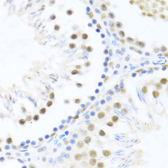 Immunohistochemistry of paraffin-embedded Rat testis using DDX46 Polyclonal Antibody at dilution of 1:100 (40x lens).